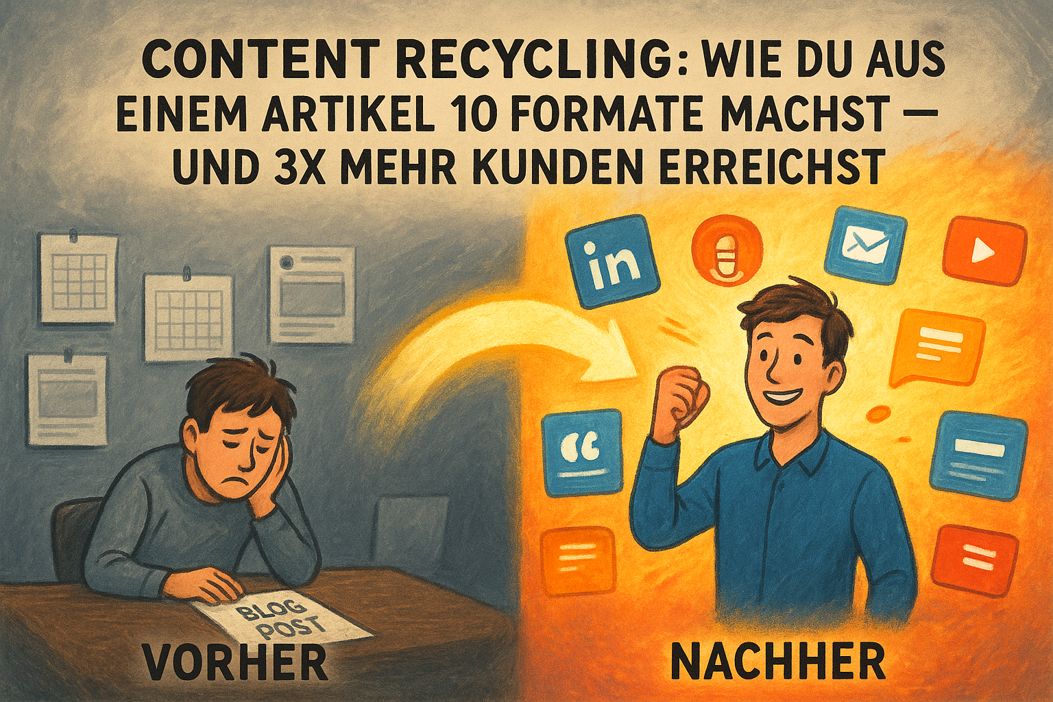 <p>Stell dir vor, du hast letzte Woche einen richtig guten Blog-Artikel geschrieben. Einen, der echten Mehrwert bietet, bei dem du dir stundenlang Gedanken gemacht hast. Und dann? Wird er einmal geteilt, vielleicht zwei Mal gelesen – und verschwindet in der digitalen Versenkung. Deine Konkurrenz dagegen ist auf LinkedIn, auf Instagram, in Podcasts, in Newsletters und bei Google gleichzeitig sichtbar. Mit denselben Inhalten. Immer und immer wieder. Du fragst dich, wie das möglich ist? Die Antwort lautet: Content Recycling.</p><br><h2>Was ist Content Recycling – und warum ignorieren es so viele KMU?</h2><br><p>Content Recycling bedeutet, einen einzigen hochwertigen Inhalt in verschiedene Formate und Kanäle zu verwandeln. Aus einem Blog-Artikel werden Social-Media-Posts, ein Video-Skript, eine Podcast-Episode, eine Infografik, eine E-Mail, ein Carousel, Zitat-Kacheln und mehr. Kein neuer Inhalt. Nur neue Verpackung.</p><br><p>Die meisten kleinen und mittelständischen Unternehmen produzieren Content wie auf einem Fließband – immer Neues, immer mehr. Dabei übersehen sie das größte Kapital, das sie bereits besitzen: ihre bestehenden Inhalte. Content Recycling ist nicht faul. Es ist strategisch klug.</p><br><h2>Die 10 Formate aus einem einzigen Artikel</h2><br><p>Nehmen wir als Beispiel diesen Artikel hier. Mit der richtigen Methode kannst du daraus Folgendes erstellen:</p><br><h3>1. LinkedIn-Textpost</h3><p>Greif den stärksten Insight heraus. Schreib ihn als kurzen, direkt formulierten Post mit Hook, Problem, Lösung und einem CTA. Fertig ist dein Beitrag für die reichweitenstärkste B2B-Plattform.</p><br><h3>2. Instagram Carousel</h3><p>Teile den Artikel in 7–10 Slides auf. Jede Slide = ein Key-Punkt. Visuelle Zusammenfassung für Nutzer, die keine langen Texte lesen – aber trotzdem deine Expertise wahrnehmen.</p><br><h3>3. Reels / TikTok-Video (60–90 Sekunden)</h3><p>Erkläre den Kerngedanken direkt in die Kamera. Du brauchst kein Produktionsstudio. Natürlich, authentisch, informativ. Das reicht – und es wird belohnt.</p><br><h3>4. YouTube-Video (5–10 Minuten)</h3><p>Tiefer, detaillierter, mit Beispielen. Das Transkript verwendest du wiederum für einen neuen Blog-Artikel oder als Grundlage für weitere Formate.</p><br><h3>5. Podcast-Episode</h3><p>Lies den Artikel ein, kommentiere ihn, diskutiere ihn mit einem Gast. Podcasts haben eine treue, hochengagierte Zuhörerschaft – besonders im B2B-Bereich.</p><br><h3>6. E-Mail Newsletter</h3><p>Fasse den Artikel für deine Abonnenten zusammen. Füge eine persönliche Anmerkung hinzu. E-Mail hat nach wie vor die höchste Conversion-Rate aller Kanäle.</p><br><h3>7. Infografik</h3><p>Visualisiere die wichtigsten Zahlen, Schritte oder Erkenntnisse. Infografiken werden dreimal häufiger geteilt als reine Texte und generieren organische Reichweite.</p><br><h3>8. Zitat-Kacheln für Social Media</h3><p>Heb die stärksten Sätze aus dem Artikel hervor, pack sie in ein ansprechendes Layout – und poste sie über Wochen hinweg. Ein Artikel = zehn Posts.</p><br><h3>9. FAQ-Seite oder Blogabschnitt</h3><p>Welche Fragen werden im Artikel beantwortet? Verwandle sie in strukturierte FAQs auf deiner Website. Das verbessert gleichzeitig dein SEO-Ranking bei Google.</p><br><h3>10. Slide-Deck / Präsentation</h3><p>Nutze den Artikel als Basis für eine Präsentation – für Kundenakquise, Webinare oder interne Schulungen. Wissen multiplizieren, ohne es neu erstellen zu müssen.</p><br><h2>Das Geheimnis: Ein System aufbauen</h2><br><p>Das Entscheidende ist nicht, ob du alle 10 Formate sofort umsetzt. Das Entscheidende ist, dass du ein System aufbaust. Viele erfolgreiche Unternehmer und Marketingteams folgen diesem einfachen Prinzip: <strong>Erst der Pillar-Content, dann die Satelliten.</strong></p><br><p>Du schreibst oder produzierst einmal pro Woche einen langen, hochwertigen Inhalt – den sogenannten Pillar-Content. Das kann ein Blog-Artikel sein, ein langes Video oder ein ausführlicher Podcast. Alles andere, was du in dieser Woche veröffentlichst, leitet sich davon ab. Kein leeres Blatt mehr. Keine Content-Lücken. Kein Stress.</p><br><h2>Warum das besonders für KMU so mächtig ist</h2><br><p>Große Unternehmen haben Content-Teams mit fünf, zehn, zwanzig Personen. Als kleines oder mittelständisches Unternehmen hast du das nicht. Aber du hast Expertise. Du hast Erfahrung. Und du hast jetzt die Methode, diese Expertise effizient über viele Kanäle gleichzeitig zu streuen – ohne jedes Mal bei Null anzufangen.</p><br><p>Content Recycling ist der Hebel, der dir als KMU die gleiche Sichtbarkeit verschafft wie ein Unternehmen mit dreimal deinem Budget. Es ist nicht weniger Arbeit. Es ist cleverere Arbeit.</p><br><h2>Dein erster Schritt: Den richtigen Artikel finden</h2><br><p>Starte mit dem Inhalt, der bereits am besten performt. Schau in Google Analytics, welche Seite die meisten Besucher anzieht. Oder frag dich: Welche Frage stellen mir meine Kunden am häufigsten? Dieser Inhalt verdient es, in alle Formate verwandelt zu werden.</p><br><p>Danach: Baue dir eine einfache Tabelle. Artikel in Spalte 1, Formate in Zeile 1. Hak ab, was du bereits umgesetzt hast. So behältst du den Überblick und weißt immer, was als Nächstes dran ist.</p><br><h2>Die besten Tools für dein Content Recycling System</h2><br><p>Du musst das nicht alles manuell machen. Es gibt heute leistungsstarke Tools, die dir den Prozess massiv vereinfachen – und dir Zeit sparen, die du lieber in dein Kerngeschäft investierst.</p><br><h3>Opus AI – Videoinhalte automatisch recyceln</h3><p><strong>Opus AI</strong> ist eines der stärksten Tools für Content Recycling im Video-Bereich. Du lädst ein langes Video hoch – etwa ein Webinar, ein YouTube-Video oder eine Podcast-Aufnahme – und Opus AI schneidet daraus automatisch die besten Kurzclips für Reels, TikTok und YouTube Shorts. Fertig. Die KI erkennt die spannendsten Momente, fügt Untertitel hinzu und format